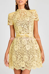 - Get your dopamine fix with this yellow dress. Crafted from bright yellow lace with a hint of skin, this dress features our signature tulip silhouette, perfect for champagne toasts, bouquets, and even until dawn. The short sleeves have padded shoulders for a modern feel, while the scalloped hem details add a feminine touch. Finish with a removable high-shine bow belt.