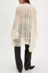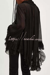 Flowy See-through Ruffle Tie-up Neck Bell Sleeve High-low Hem Cape Shirt
