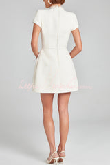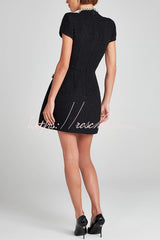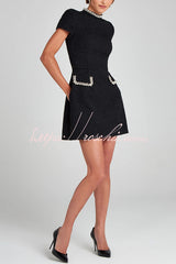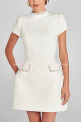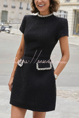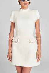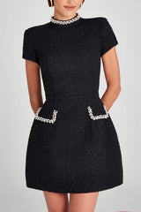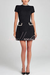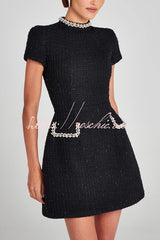 Exquisite and Playful Tweed Fabric Pearl Trim Short Sleeve Pocketed Mini Dress