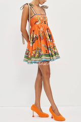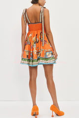 Linen Blend Unique Print Suspender Tie Casual Mini Dress