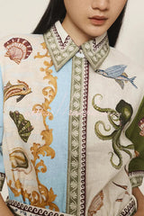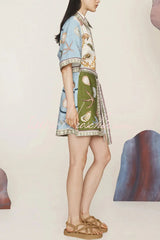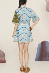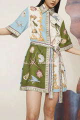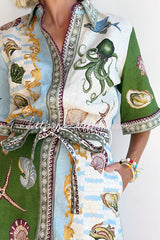 Deep Sea Dreaming Linen Blend Unique Print Tie-up Pocketed Shirt Mini Dress
