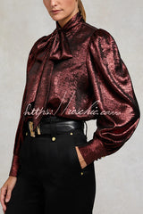 Ariella Metallic Satin Fabric Tie-up Bow Neck Long Sleeve Blouse