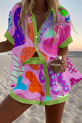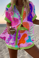Geometric Abstract Print Loose Button Elastic Waist Shorts Set