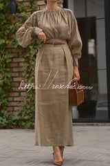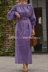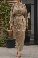 Solid Color Round Neck Long-sleeved Pleated Shirt and Elegant Maxi Skirt Set