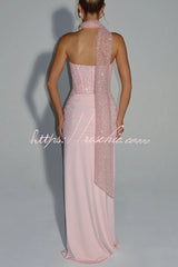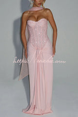 Carina Sequined and Satin Jersey Off Shoulder Ruched Knot Drape Maxi Dress