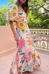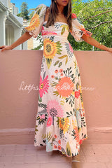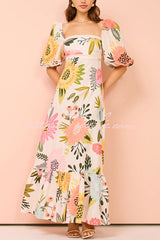 Looking for Sunshine Floral Print Square Neck Bubble Sleeve Maxi Dress