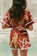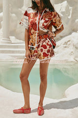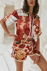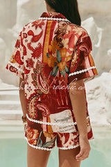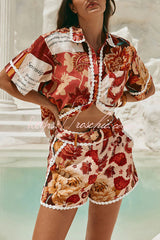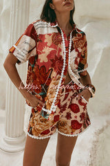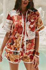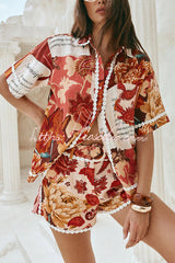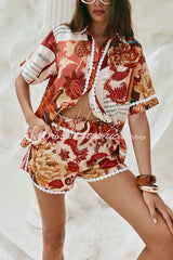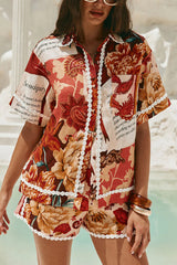 Unique Printed Collared Short-sleeved Loose-fitting Shirt and Casual Floral Trim Shorts Set