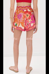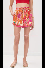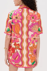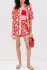 Neima Unique Print Wave Trim Button Up Short Sleeve Shirt and Elastic Waist Pocket Loose Shorts Set