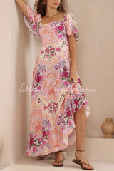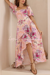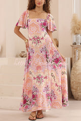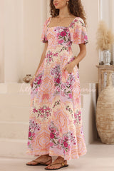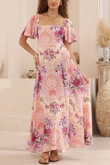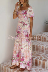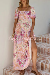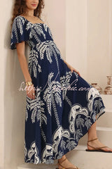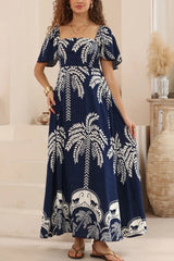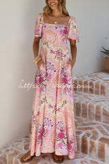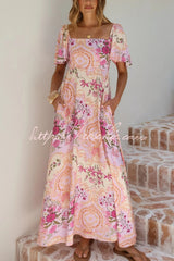 Plant Print Short-sleeved Square Neck Casual Pocket Holiday Midi Dress