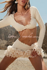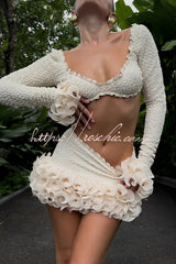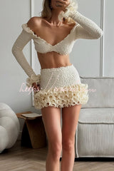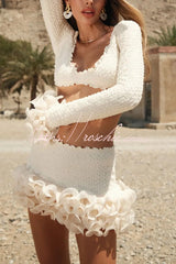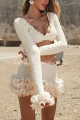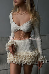 Solid Color V-neck Long-sleeved Crop Top and Fitted Layered Ruffle Mini Skirt Set