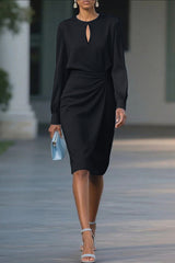 Solid Color Hollow Round Neck Long Sleeve Waisted Midi Dress