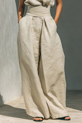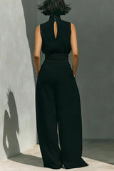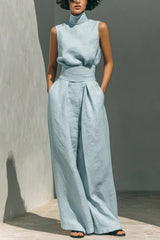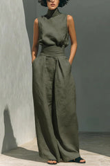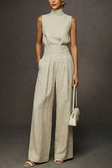 Linen Blend Solid Color Turtleneck Sleeveless Top and Casual High-waisted Elastic Waist Pocket Wide-leg Pants Set
