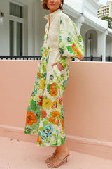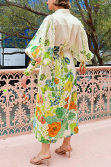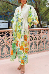 Summer Party Floral Print Balloon Sleeve Pocketed Belt Shirt Midi Dress