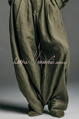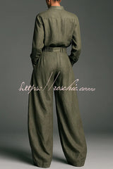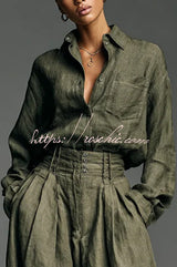 Linen Blend Lapel Long-sleeved Casual Shirt and High-waist Pocket Loose Wide-leg Pants Set