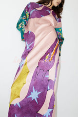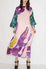 Artistic Nature Satin Unique Print Contrast Slit Relaxed Vacation Maxi Dress