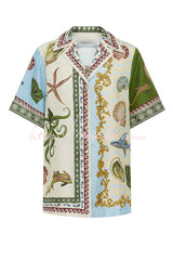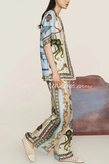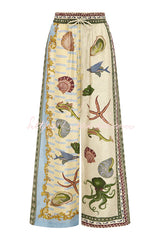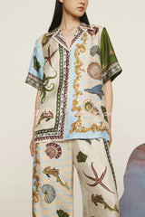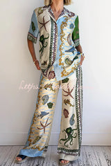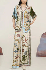 Deep Sea Dreaming Satin Unique Print Short Sleeve Shirt and Elastic Waist Pocketed Pants Set