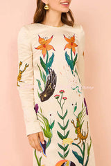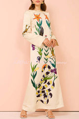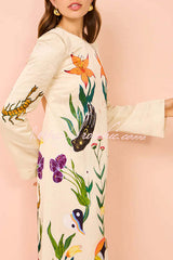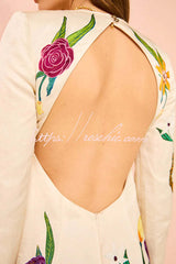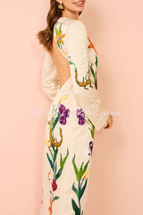 - The dress combines modern elegance with artistic sophistication. Made from a satin fabric, it has a cylindrical silhouette with a low cutout at the back, slightly flared sleeves and side slits to make it easy to wear between weddings and formal events.