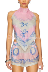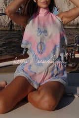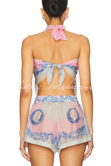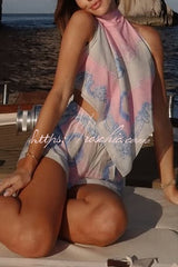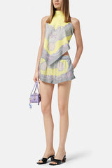 Amalfi Coast Satin Unique Print Scarf Top and Elastic Waist Pocket Loose Shorts Set