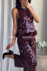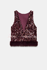 Gala Goddess Sequin Faux Fur Trim Crew Neck Sleeveless Loose Top