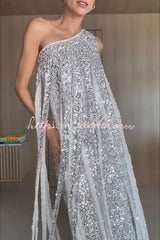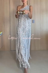 Holiday Muse Sequined Slit Tassels One Shoulder H-line Maxi Dress