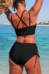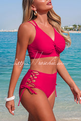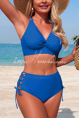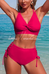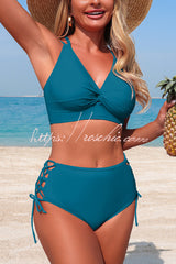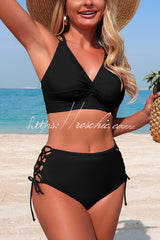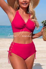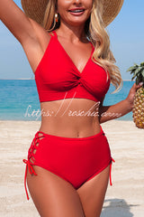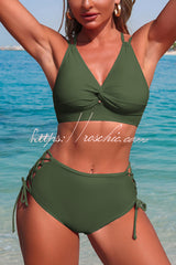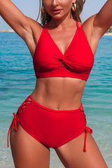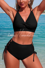 Solid Color V-neck High-waisted Hollowed-out Tie Two-piece Stretch Bikini Swimsuit