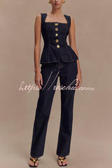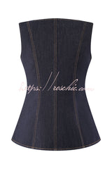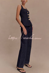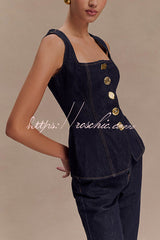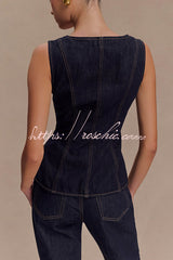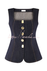 - The sleeveless button-down denim top is a modern take on a classic silhouette, blending structure with effortless cool. This long silhouette has a sleek square neckline and sleeveless silhouette for a precise flattering fit. Front and back panels create a sculpted fit, while custom mismatched buttons add a playful, unique touch. The front button closure gives it a polished edge, making it the perfect piece to layer or wear alone.