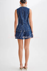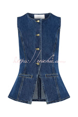 - Presenting the Denim Button Up Top, a modern essential for your wardrobe rotation. Boasting a round neckline and a convenient centre front button closure, this sleeveless top offers a versatile and chic aesthetic. The addition of front mock pockets adds a hint of utilitarian flair, while princess seams ensure a flattering silhouette.