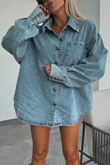 Fashion Lapel Button Pocket Denim Jacket and Irregular Mini Skirt Set