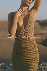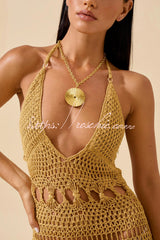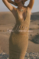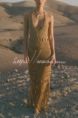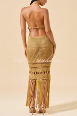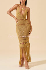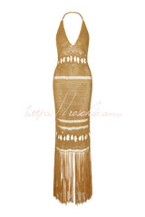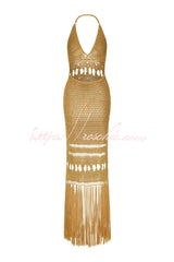 Fashionable Open-knit Backless Elegant Tassel Hem Vacation Cover-up Maxi Dress