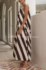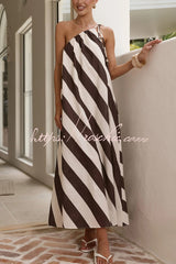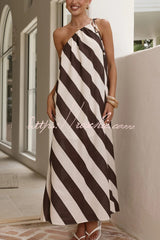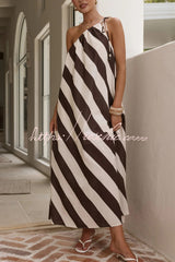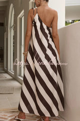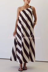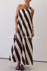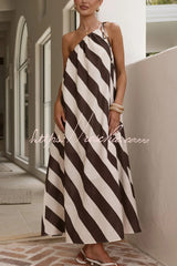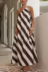 Fashionable Striped Print Loose One-shoulder Tie Vacation Maxi Dress