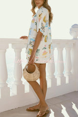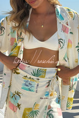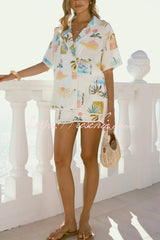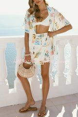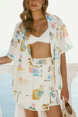 Resort-print Loose-fitting Lapel Short-sleeved Shirt and Casual Tie Mini Skirt Set
