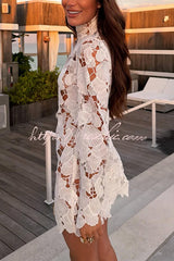 Tropica View Crochet Lace Seashell High Neck Long Bell Sleeve Mini Dress