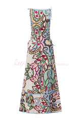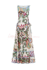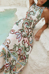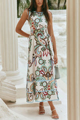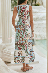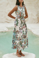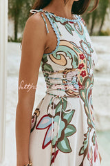 Unique Botanical Print Serrated Trim Round Neck Sleeveless Tie Casual Maxi Dress