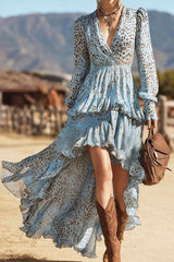 Unique Print V-Neck Long Sleeve Irregular Ruffle Maxi Dress