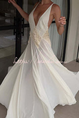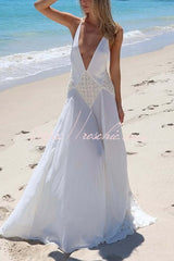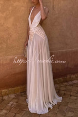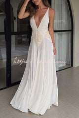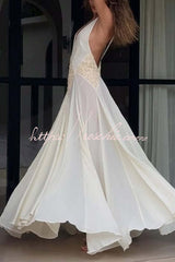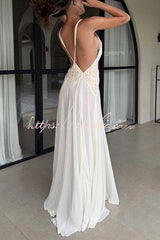 - Designed for the modern muse, it features a plunging neckline and feminine lace accents at the bodice. Adjustable straps meet at the back to create a dramatic and sexy open back. This gown blends beautifully with a soft pleated skirt for an elegant yet effortless look. Crafted in lightweight georgette that embodies freedom and fluidity; perfect for intimate celebrations or romantic getaways.