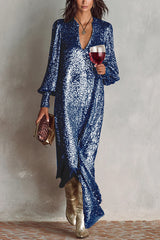 Minimalist Sparkling Sequin V-neck Long Balloon Sleeve Slit Party Maxi Dress