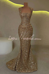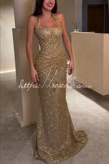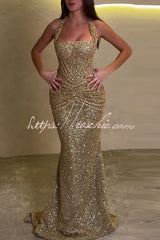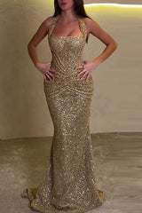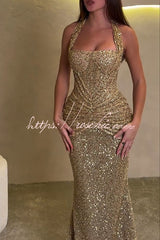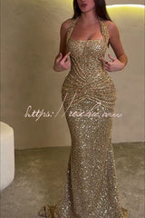 Velda Sequin Halter Square Neck Ruched Waist Back Lace-up Drape Flare Maxi Dress