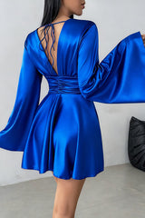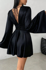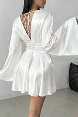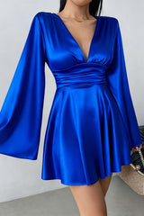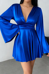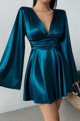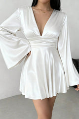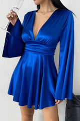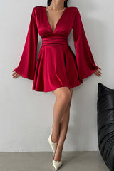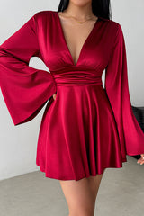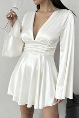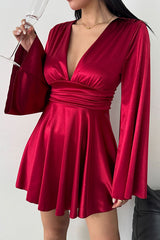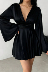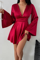 Solid Color V-neck Flared Long Sleeves Slim-fit Elegant Mini Dress