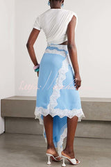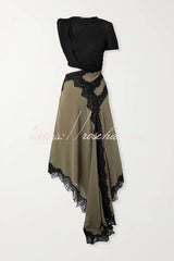 Verve Ribbed Jersey Cutout Waist Asymmetric Satin Lace Hem Maxi Dress