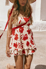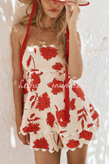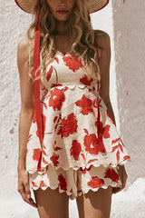 Rosella Linen Blend Floral Wave Trim Tube Top and Elastic Waist Loose Shorts Set