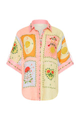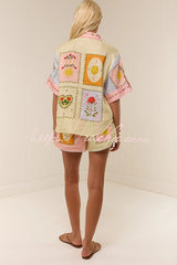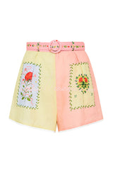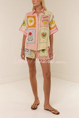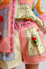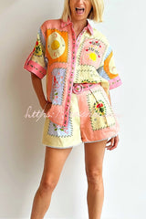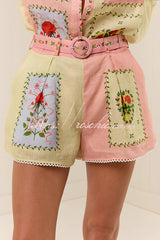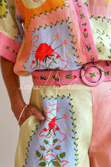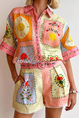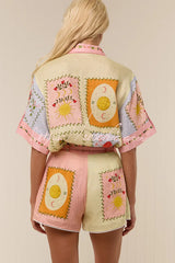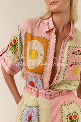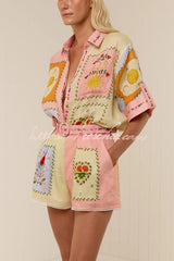 Lily Song Linen Blend Unique Print Short Sleeve Shirt and Belted Pocket Shorts Set