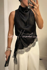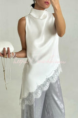 Nayla Satin Lace Trim High Neck Irregular Slit Hem Sleeveless Top
