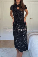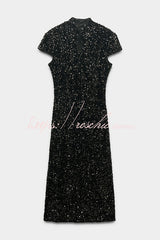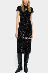 Cheongsam Style Velvet Sequin Stand Neck Short Sleeve Slit Midi Dress
