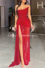 Lysette Sequin Pleated Design Irregular Off-shoulder Slit Drape Gown Maxi Dress