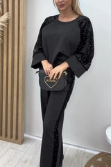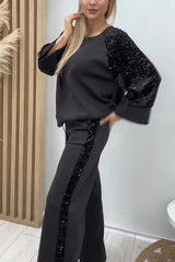 Stylish Sequined Loose-fitting Crew Neck Top and Casual Pocket Wide-leg Pants Set