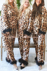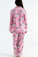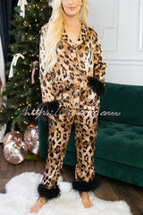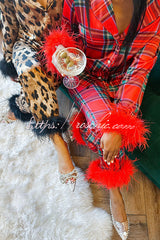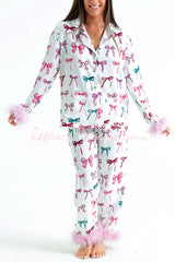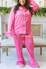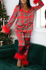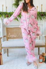 Christmas Besties Party Printed Feather Trim Elastic Waist Pocketed Pajama Set