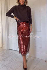 Upper East Chic Sequin Mesh Trim High Rise Slit Pencil Midi Skirt