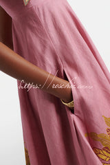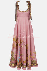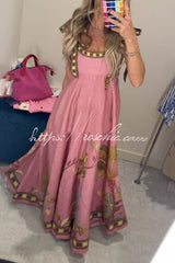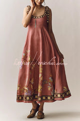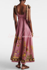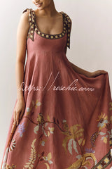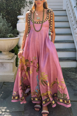 Linen Blend Unique Printed Tie-up Suspenders Pocket Elegant Vacation Maxi Dress