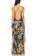 Desert Queen Embroidered Lace-up Leopard Colorblock Layered Slit Maxi Dress