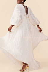 Wedding Guests Pleated Textured Chiffon Fabric Balloon Sleeve Open Back Maxi Dress